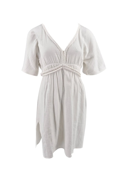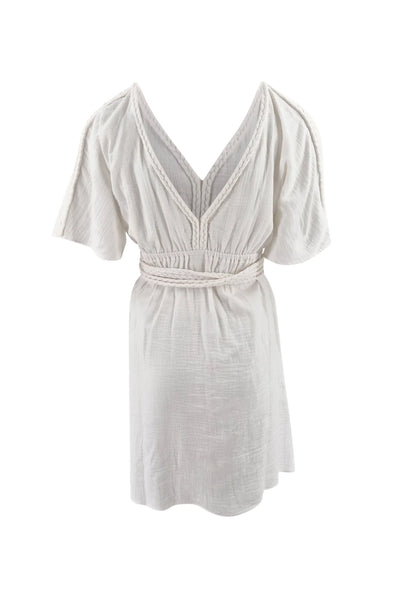 De Romy Short Dress off white heeft een V hals met gevlochten afwerking. Dit detail geeft de jurk een subtiele bohemian touch. De taille wordt licht geaccentueerd voor een vrouwelijk silhouet. De korte lengte maakt het ontwerp luchtig en speels.