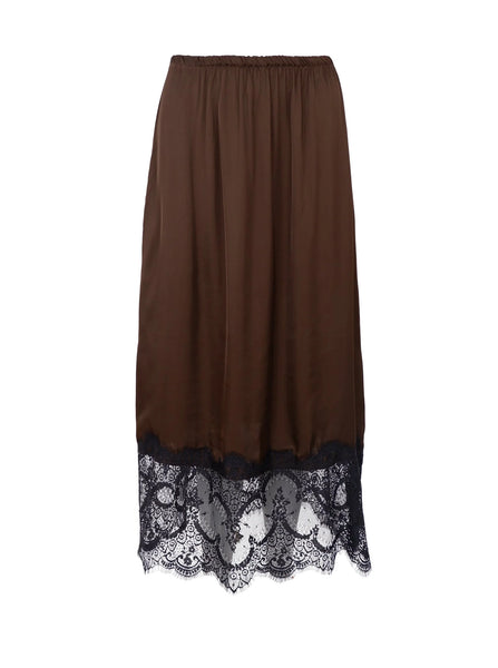 Feminine midi skirt with elastic waist for a comfortable fit. The skirt has an elegant design with lace trim at the bottom, giving a sophisticated and slightly transparent look. Perfect for both everyday wear and festive occasions, depending on how it is styled.